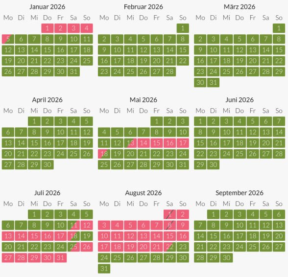 Mindestaufenthalt 3 Übernachtungen in Saison B/C/D und 7 Übernachtungen in Saison A. Bitte haben Sie dafür Verständnis, dass in der Saison A nur Buchungen von Sa-Sa möglich sind.